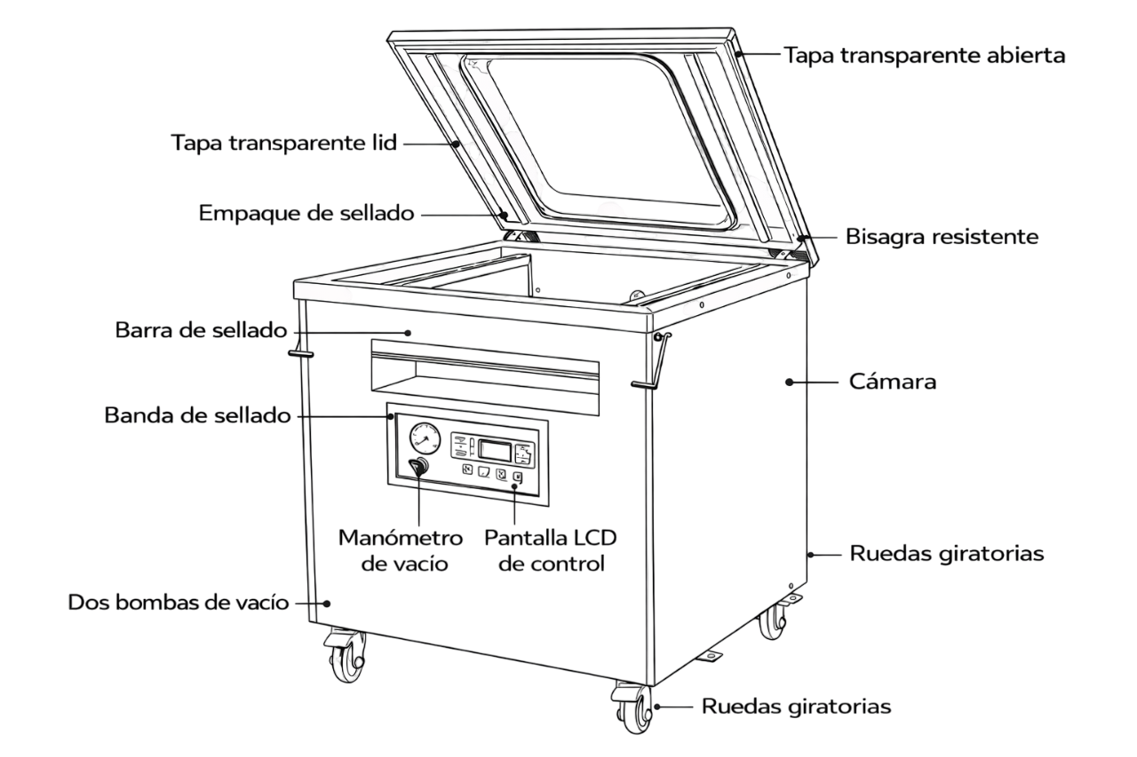 La empacadora de cámara profunda con barras de 61 cm está diseñada para procesos industriales de alto rendimiento, capaz de empacar más de 700 unidades en jornadas de 4 horas, dependiendo del tamaño del empaque. Su doble cámara permite una producción continua y eficiente, con resultados de alta calidad.
